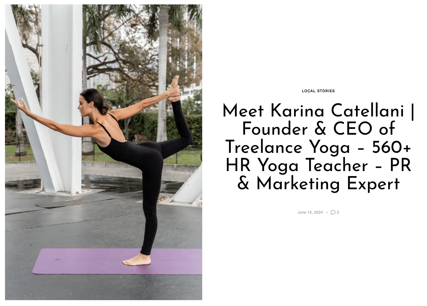 Karina Catellani, founder of Treelance Yoga, shares her journey as a 560-hour certified yoga teacher and her background in PR and marketing. In this interview with Shoutout Miami, she reflects on building a brand inspired by mindfulness, balance, and intentional living.